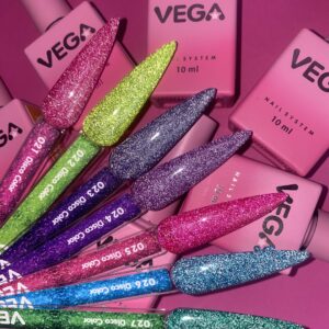 Disco Vega — це колекція гель-лаків із мільйонами мікроглітерів, які неймовірно сяють під світлом. Створена для тих, хто любить ефект вау! Ідеальна як для повсякденного манікюру, так і для вечірніх образів.